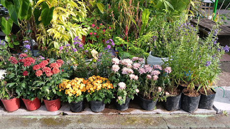 Lebih jauh ke sisi jalan, deretan pot berisi bunga krisan, aster ungu, dan tanaman bunga lainnya tersusun rapi di depan rumah warga. Masing-masing tanaman menunjukkan tanda-tanda perawatan yang teratur: daun-daun segar tanpa cela, bunga-bunga bermekaran dengan warna-warna cerah, dan tanah yang lembap menandakan penyiraman rutin. Pot-pot dari berbagai jenis — plastik, tanah liat, hingga daur ulang — memperlihatkan semangat memanfaatkan apa yang ada untuk menciptakan sesuatu yang bermanfaat.
